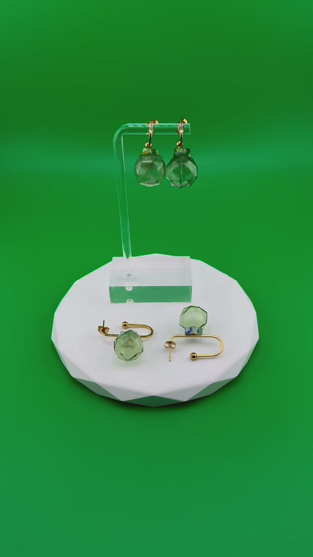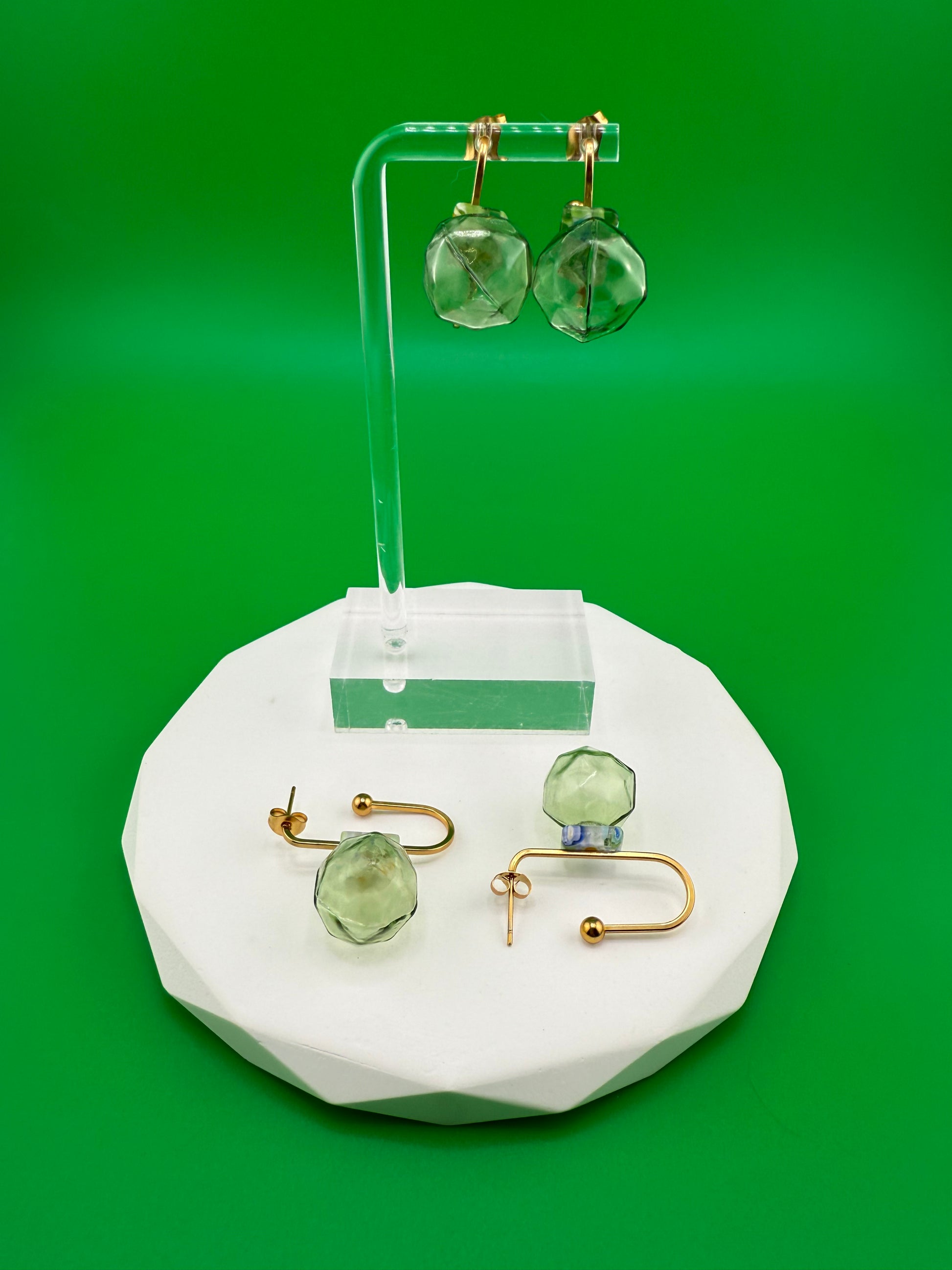 Handmade in New York, these stainless steel earrings blend bold geometry with artisanal glasswork. A luminous octagonal glass sphere floats over a rectangular Murano glass base, creating a striking, one-of-a-kind design.