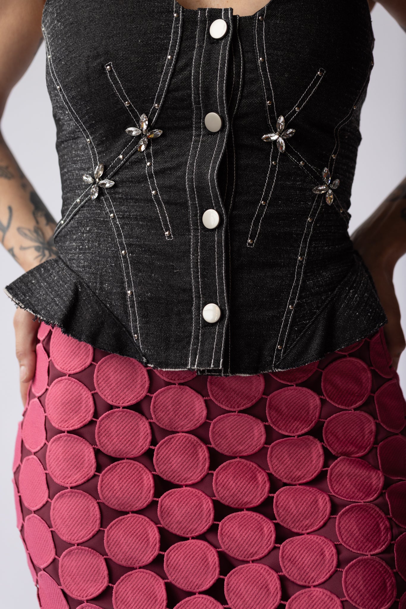 Step into a world of movement and elegance with this stunning statement skirt. Designed for those who love to stand out, its cascading geometric cutouts create a mesmerizing play of texture and dimension, swaying beautifully with every step. Perfectly blending artistic flair with refined sophistication, this piece is a showstopper for creative souls and fashion-forward individuals alike. Whether paired with a structured corset for a bold evening look or a casual top for effortless chic, this skirt transforms any outfit into a wearable work of art.