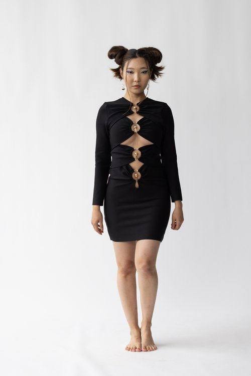Step into a masterpiece of sensuality and bold design. This ultra-flattering, body-hugging dress is crafted from a sleek, stretchy fabric that moves like a second skin. The striking cut-out details at the chest—accented with metallic embellishments—create an architectural allure that is both daring and elegant. Long sleeves contrast with its short, sculpted silhouette, making it the perfect blend of mystery and seduction. Available in deep black and a sultry olive green, this dress isn’t just an outfit—it’s an attitude. Minimal in the back, all the drama in the front, designed for those who know that true art is meant to be worn.