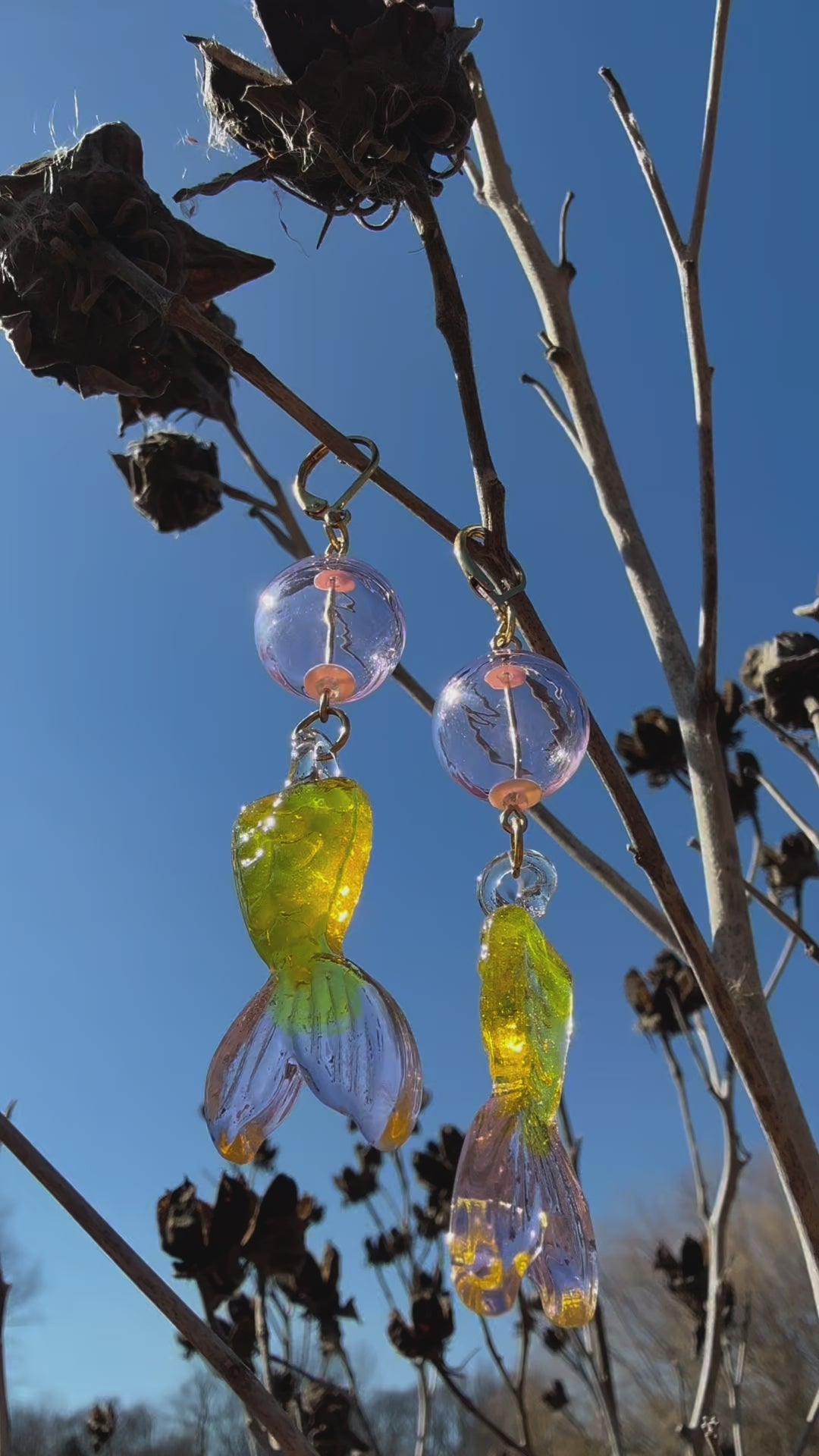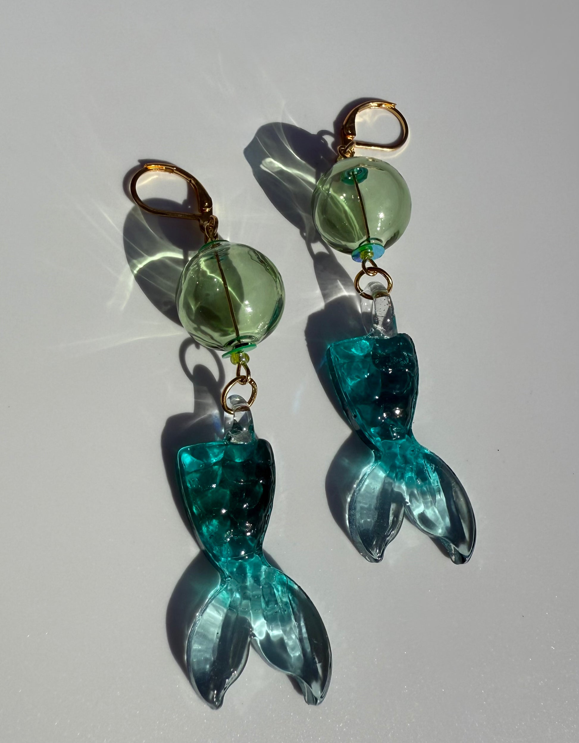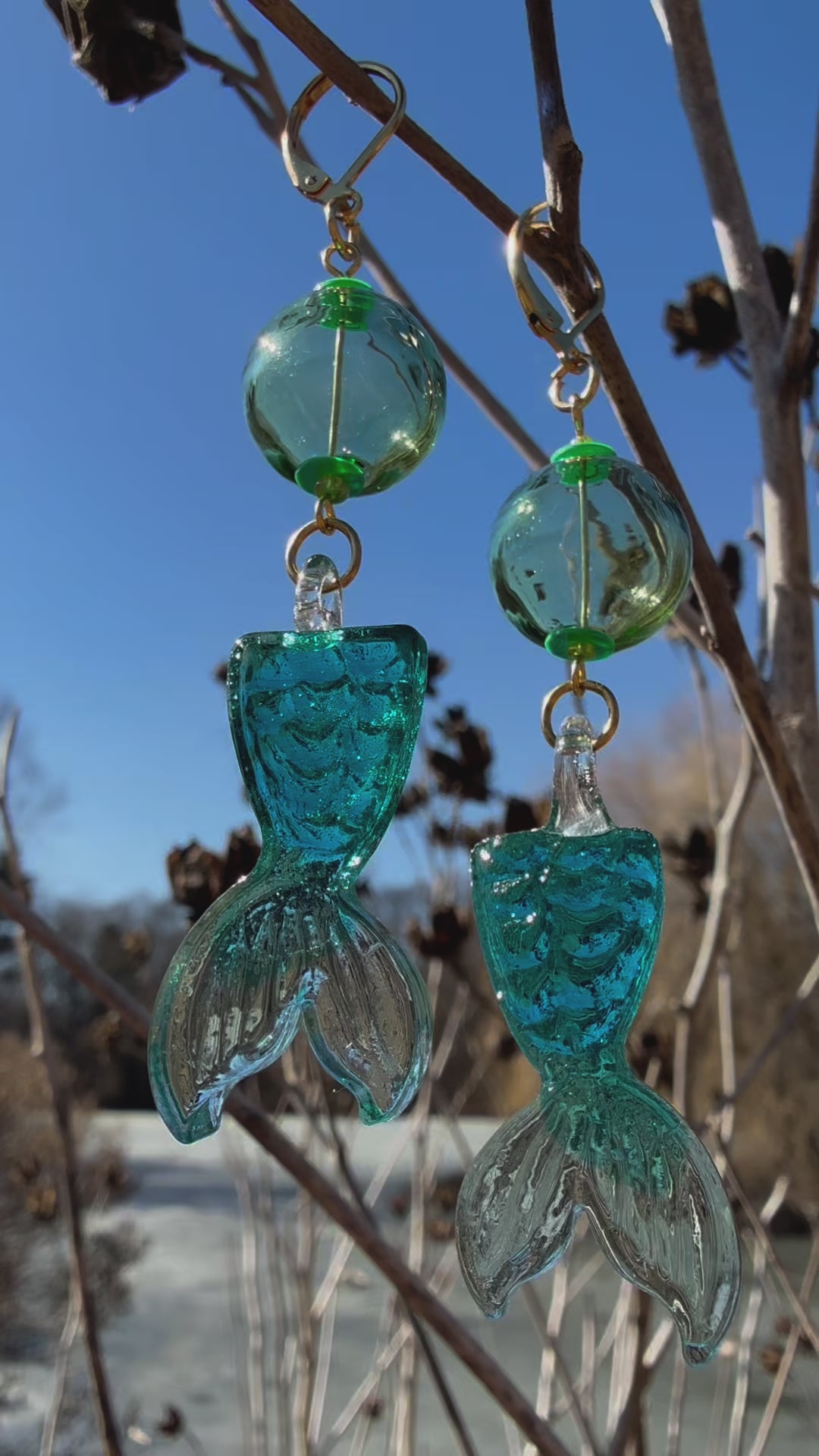 Dive into a world of magic with these handcrafted glass earrings, inspired by the graceful tail of a mermaid. Super lightweight, made with stainless steel, hypoallergenic, and nickel-free—perfect for everyday enchantment. WEARABLE ART.