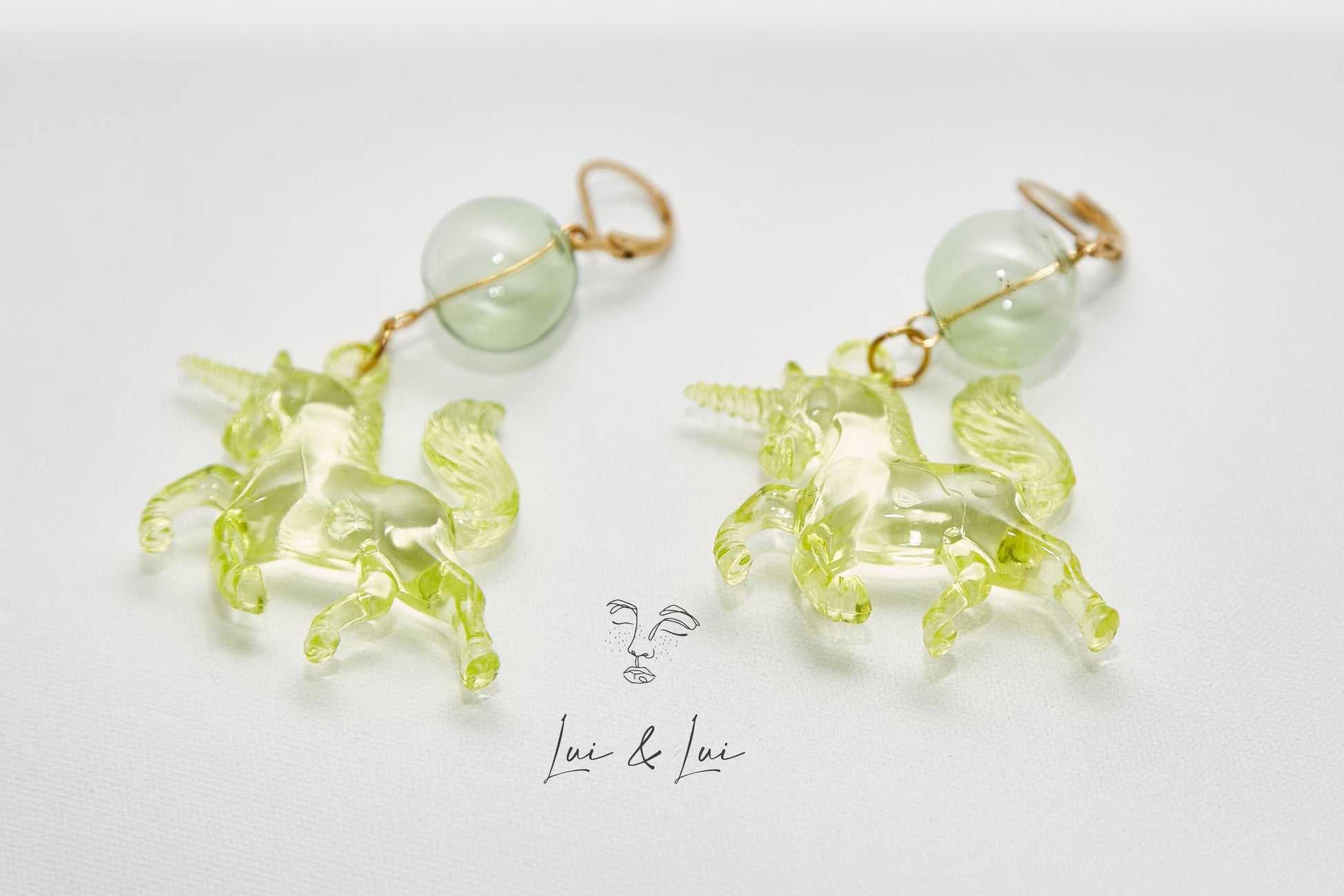 Beautiful and fun acrylic unicorn earrings w/ glass ball.